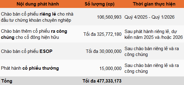 Cụ thể, phương án chào bán ra công chúng sẽ có số lượng tối đa gần 325.8 triệu cp, tương ứng tỷ lệ 5:1 (1 cp sẽ có 1 quyền mua, 5 quyền được mua 1 cp mới), xác định theo lượng cổ phiếu sau đợt chào bán riêng lẻ. Thời gian thực hiện trong năm 2025 và/hoặc 2026.