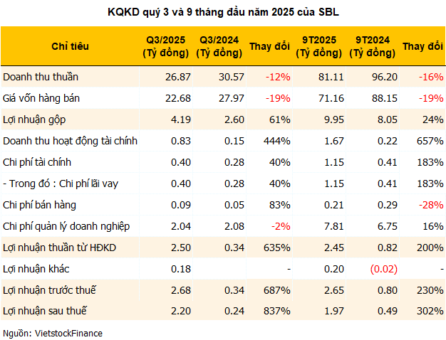 Quý 3/2025, SBL ghi nhận lãi ròng cao nhất 2 năm, đạt hơn 2.2 tỷ đồng, tăng tới 837% so với cùng kỳ, bất chấp doanh thu giảm 12% còn dưới 17 tỷ đồng, nhờ chi phí nguyên liệu thấp và doanh thu tài chính tăng mạnh. Biên lãi gộp được cải thiện rõ rệt lên 15.6%, so với mức 8.5% cùng kỳ.