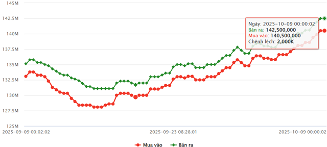 Sáng ngày 09/10, Công ty SJC niêm yết giá vàng miếng ở chiều mua - bán là 140.5 - 142.5 triệu đồng/lượng. Vàng nhẫn cũng niêm yết ở mức 136.8 - 139.5 triệu đồng/lượng.
