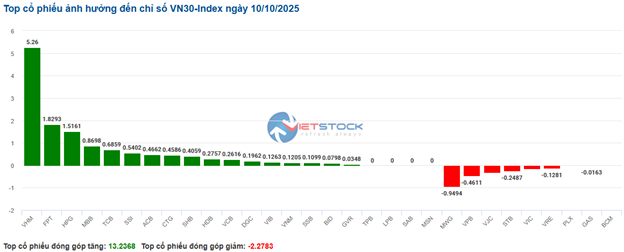| Top 10 cổ phiếu tác động mạnh tới VN-Index phiên 10/10/2025 (tính theo điểm) | ||