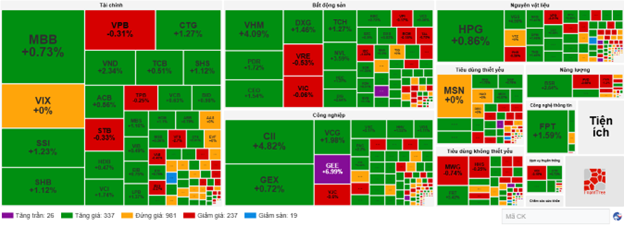 Bên cạnh đó, các nhóm bất động sản và công nghiệp cũng giao dịch sôi động với khi lực cầu tập trung ở các mã như VHM (+4.7%), PDR (+1.72%), CEO (+1.93%), NVL (+2.61%), KBC (+2.86%), NLG (+2.94%), DIG (+3.13%); CII (+5.01%), VCG (+1.62%), VSC (+2.61%), GMD (+2.23%) và GEE tăng hết biên độ.
