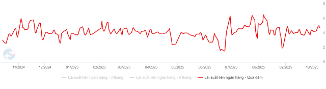 Trên thị trường liên ngân hàng, lãi suất qua đêm tăng nhẹ lên 4.79%/năm (tăng 52 điểm cơ bản), còn giá trị giao dịch bình quân nhích 4.3% so với tuần trước, đạt khoảng 589 nghìn tỷ đồng/ngày.