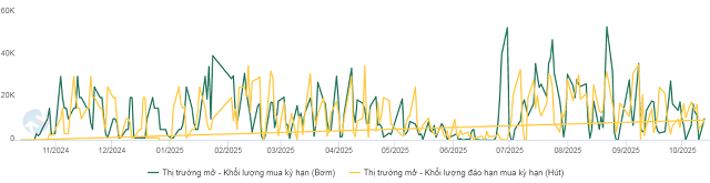 Cụ thể, xu hướng hút bớt thanh khoản thể hiện ở việc hạn chế phát hành hợp đồng mua kỳ hạn mới so với lượng đáo hạn. Trong tuần, chỉ có 59,301 tỷ đồng hợp đồng mua kỳ hạn với lãi suất 4%/năm được phát hành, trong khi 78,659 tỷ đồng đáo hạn trên kênh này. Qua đó, NHNN hút ròng 19,358 tỷ đồng, đưa khối lượng lưu hành trên kênh mua kỳ hạn giảm xuống còn 178,870 tỷ đồng.