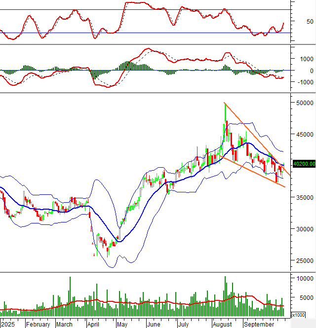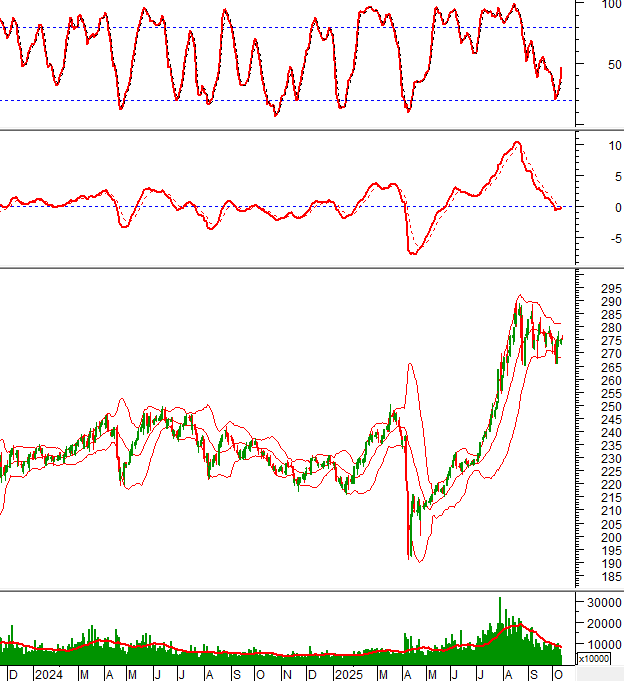 Trong phiên giao dịch sáng ngày 10/10/2025, HNX-Index vẫn chưa thoát khỏi trạng thái giằng co và đang dao động xoay quanh đường Middle của Bollinger Bands.
