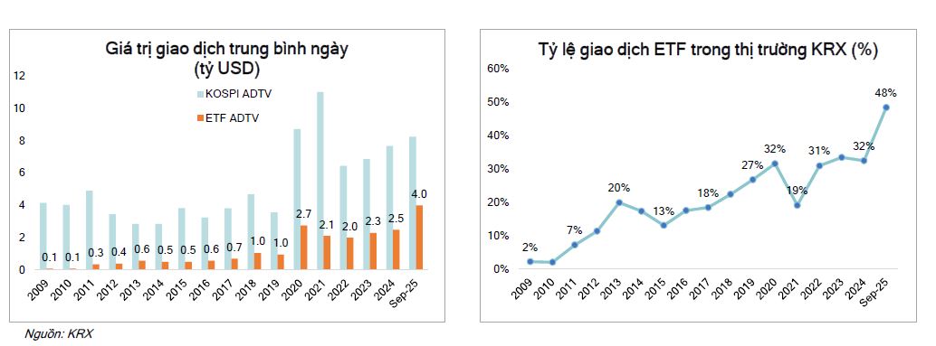 Giá trị giao dịch các sản phẩm ETF chiếm 40% đến 50% giá trị giao dịch trên thị trường. Cơ cấu nhà đầu tư có hơn 50% nhà đầu tư là cá nhân và nước ngoài (khoảng 30% cá nhân và 20% nước ngoài). Sự tham gia từ các tài khoản như trí cá nhân, hưu trí doanh nghiệp và tài khoản ủy thác đầu tư đã thúc đẩy tăng trưởng nhóm nhà đầu tư cá nhân. Bên cạnh đó, chi phí thấp và sự đa dạng của các loại ETF đã thu hút mạnh mẽ dòng vốn từ nhà đầu tư nước ngoài.