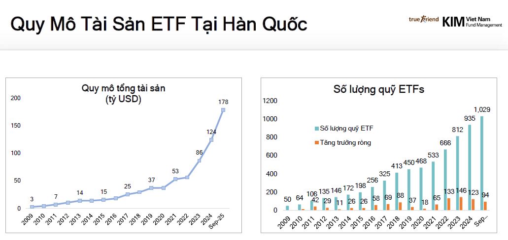 Tới tháng 9/2025, thị trường ETF Hàn Quốc tổng tài sản quản lý (AUM) đạt 180 tỷ USD với hơn 1,000 sản phẩm ETF.
