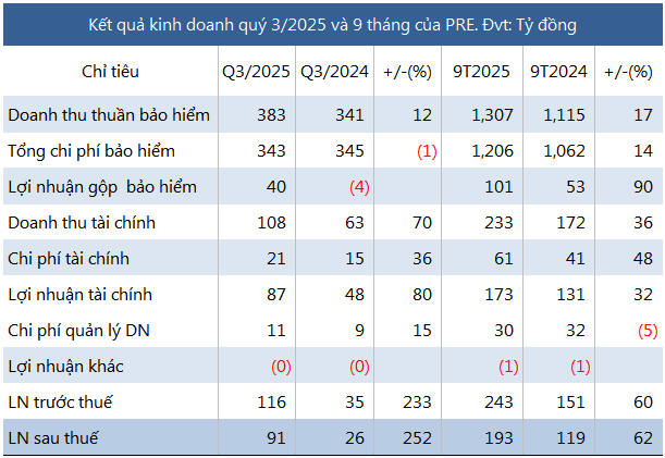 Cụ thể, quý 3, PRE ghi nhận doanh thu phí nhận tái bảo hiểm gần 740 tỷ đồng, tăng 27% so với cùng kỳ. Trong khi đó, chi phí nhượng tái bảo hiểm tăng 7% lên 345 tỷ đồng, dẫn đến doanh thu thuần bảo hiểm tăng 12%, đạt 383 tỷ đồng.
