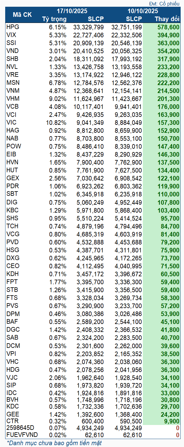 Thay đổi cổ phiếu VNM ETF trong tuần từ 10-17/10/2025