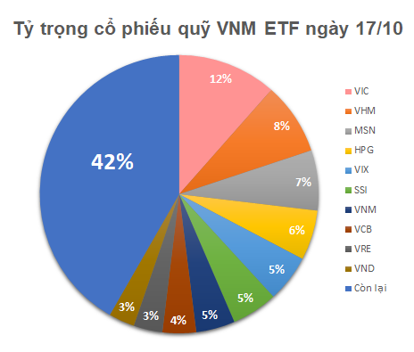 Thời điểm ngày 17/10, tổng giá trị tài sản của quỹ VNM ETF đã vượt 611 triệu USD, tăng đáng kể so với mức hơn 590 triệu USD ghi nhận vào ngày 10/10. Tài sản được phân bổ cho 51 mã cổ phiếu, 1 chứng chỉ quỹ và 1 quyền mua cổ phiếu. Top 1 tỷ trọng là VIC với hơn 11.5%. Kế đến lần lượt là VHM (8.39%), MSN (6.99%), HPG (5.81%), VIX (5.48%).