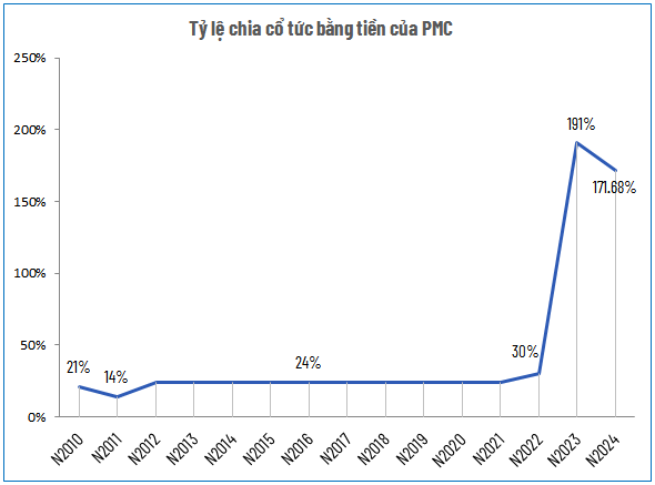 Nhờ chính sách cổ tức tiền mặt hấp dẫn, thị giá PMC đạt mức cao trên sàn. Sáng 08/10, cổ phiếu này giao dịch quanh 109,000 đồng/cp, tăng 65% so với đầu năm 2024.