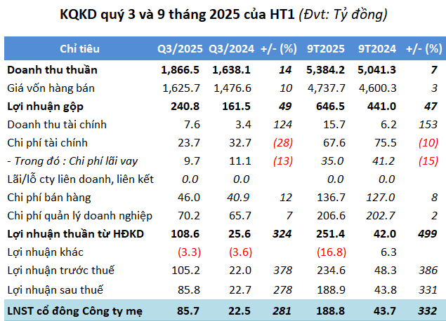 Lũy kế 9 tháng, doanh thu thuần hơn 5,384 tỷ đồng, tăng 7%; trong khi lãi sau thuế gần 189 tỷ đồng, gấp 4.3 lần. So với kế hoạch tổng doanh thu hợp nhất hơn 7,162 tỷ đồng và lợi nhuận sau thuế 184 tỷ đồng trong năm 2025, HT1 thực hiện được 75% mục tiêu doanh thu và vượt 3% chi tiêu lãi sau thuế.