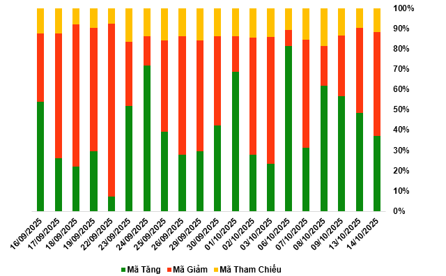 Kết thúc phiên giao dịch ngày 14/10/2025, toàn thị trường có 98 mã tăng, 135 mã giảm và 31 mã tham chiếu.