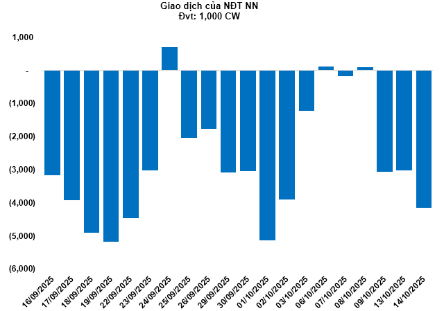 Kết thúc phiên giao dịch ngày 14/10/2025, toàn thị trường có 98 mã tăng, 135 mã giảm và 31 mã tham chiếu. Khối ngoại tiếp tục bán ròng với tổng mức bán ròng đạt 4.15 triệu CW.
