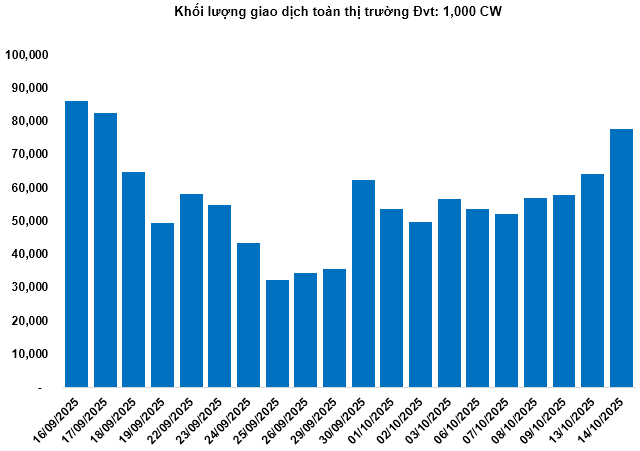 Khối lượng giao dịch toàn thị trường trong phiên 14/10 đạt 77.5 triệu CW, tăng 21.12%; giá trị giao dịch đạt 239.71 tỷ đồng, tăng 22.45% so với phiên 13/10. Trong đó, CFPT2404 là mã dẫn đầu thị trường về khối lượng với 1.87 triệu CW; CVHM2514 dẫn đầu về giá trị giao dịch với 12.16 tỷ đồng.