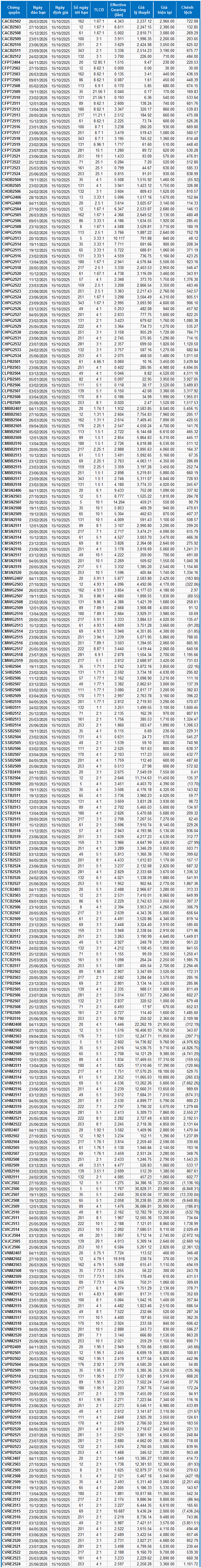 Dựa trên phương pháp định giá phù hợp với thời điểm khởi đầu là ngày 15/10/2025, mức giá hợp lý của các chứng quyền đang được giao dịch trên thị trường được thể hiện như sau: