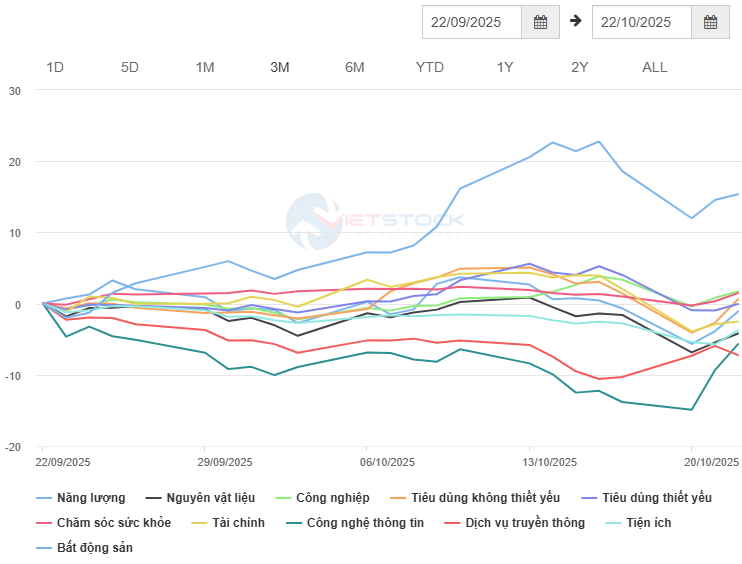 Dữ liệu của VietstockFinance cho giai đoạn 1 tháng qua cho thấy tỷ suất vô cùng phân hóa giữa các ngành. Nhóm tăng trưởng dương bao gồm tiêu dùng không thiết yếu (+0.62%), chăm sóc sức khỏe (+1.48%), công nghiệp (+1.7%) và đặc biệt ngành có tỷ trọng vốn hóa rất lớn là bất động sản (+15.37%) đi cùng đà tăng vượt trội của nhóm Vingroup.