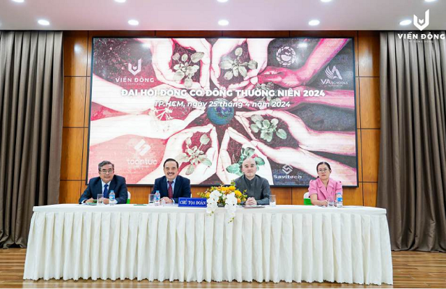 Ông Bùi Quang Khoa (thứ hai từ trái sang) và ông Trần Hoàng Nghĩa (ngoài cùng bên trái) tại ĐHĐCĐ năm 2024 của VID
