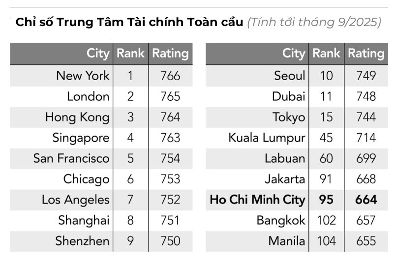 Mặc dù TP. Hồ Chí Minh về mặt kỹ thuật đã là một trung tâm tài chính, nhưng hiện chủ yếu phục vụ thị trường Việt Nam. Không giống các đối thủ cạnh tranh, thành phố không có các ưu đãi cạnh tranh của Chính phủ hoặc hệ thống pháp lý tiến bộ, đồng thời còn áp đặt hạn chế đối với các sản phẩm tài chính và dòng vốn. Hiện thành phố xếp hạng thứ 95 trong số 120 trung tâm trên chỉ số toàn cầu.