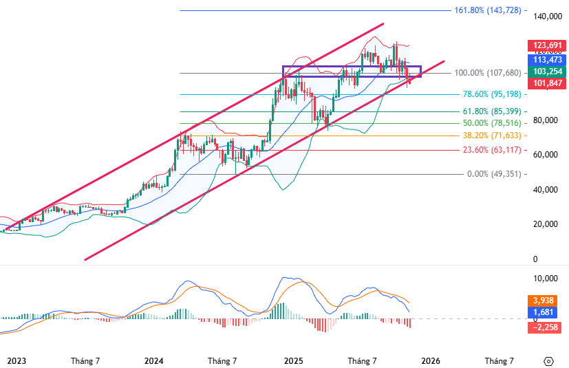 Ở khung đồ thị tuần, giá BTC đang kiểm tra lại cạnh dưới của kênh giá tăng (Bullish Price Channel) trung hạn sau khi đồng tiền này diễn biến không mấy thuận lợi khi test ngưỡng Fibonacci Projection 100% (tương đương vùng 105,700-111,500 USD) như đã đề cập trong Báo cáo Tiền ảo tháng 10/2025 (Kỳ 1).