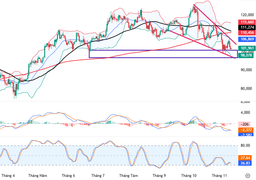 Quay trở lại khung đồ thị ngày, giá BTC đang diễn biến đi ngang với các phiên tăng giảm đan xen đồng thời đang trong quá trình hình thành mẫu hình Falling Wedge sau khi kiểm tra lại đáy cũ tháng 06/2025 (tương đương vùng 97,000-101,000 USD).