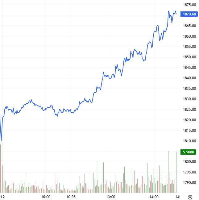 Trong phiên giao dịch ngày 12/11/2025, hợp đồng 41I1FB000 bật tăng và diễn biến giằng co với lợi thế nghiêng về bên mua trong nửa đầu phiên và phe Long dần áp đảo giúp cho I1FB000 bứt phá mạnh mẽ trong thời gian còn lại của phiên sáng. Bước sang phiên chiều, áp lực bán gần như mất hút đã tạo cơ hội cho bên mua dễ dàng kéo hợp đồng này tiếp tục tăng vọt đến hết phiên và đóng cửa trong sắc xanh với mức tăng 55.6 điểm.
