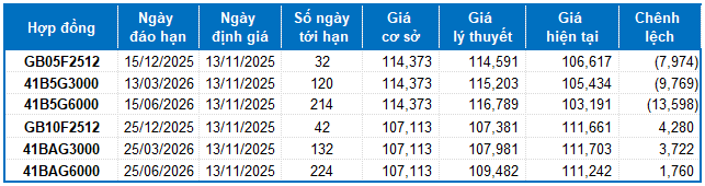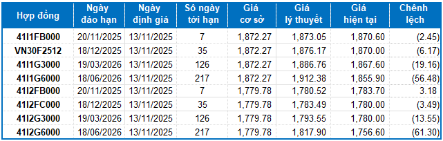 Dựa trên phương pháp định giá hợp lý với thời điểm khởi đầu ngày 13/11/2025, khung giá hợp lý của các hợp đồng tương lai đang được giao dịch trên thị trường được thể hiện như sau: