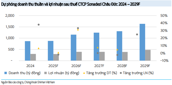SSV dự kiến doanh thu thuần CTCP Sonadezi Châu Đức đạt khoảng 879 tỷ đồng (tăng 1% so với năm trước) trong năm 2025 và 1,156 tỷ đồng (tăng 31%) trong năm 2026. Lợi nhuận sau thuế năm 2025 dự kiến đạt 297 tỷ đồng (giảm 2%) và lợi nhuận sau thuế năm 2026 dự kiến đạt 396 tỷ đồng (tăng 33%).