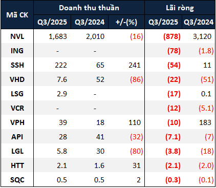 12 doanh nghiệp BĐS thua lỗ trong quý 3/2025. Đvt: Tỷ đồng