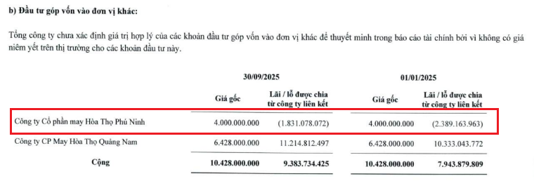 May Hòa Thọ - Phú Ninh có vốn điều lệ 20 tỷ đồng, HTG góp 20% vốn, tương ứng 4 tỷ đồng và duy trì cho đến hiện tại. Tại thời điểm 30/09/2025, HTG ghi nhận phần lỗ hơn 1.8 tỷ đồng từ công ty liên kết này, thấp hơn khoản lỗ gần 2.4 tỷ đồng đầu năm.