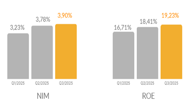 Biên lợi nhuận (NIM) của Ngân hàng đang có xu hướng gia tăng từ 3.23% (quý 1/2025) lên 3.9% (quý 3/2025). Tỷ suất lợi nhuận trên vốn chủ sở hữu (ROE) cũng tích cực, cải thiện từ 16.71% lên 19.23%.