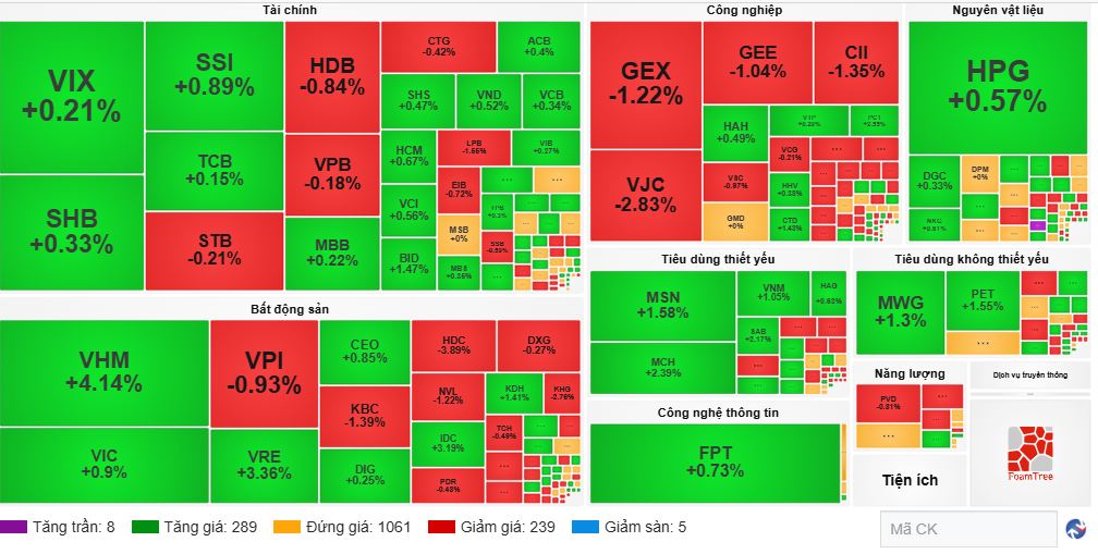 Các nhóm bất động sản, tài chính rơi vào diễn biến phân hóa. Tuy vậy, vẫn có các cổ phiếu trụ duy trì đà tăng cho chỉ số. Ở nhóm bất động sản, VHM, VIC, VRE đang là trụ cột chính. Ở nhóm tài chính, VIX, SSI, TCB, VPB, ACB… đang là các mã duy trì sắc xanh.