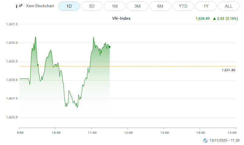 Chứng khoán Việt Nam mở cửa phiên 13/11 với diễn biến tăng nhẹ. Tính đến 9h30, VN-Index tăng 0.84 điểm lên 1,632.7, HNX-Index tăng 0.4 điểm lên 265.19 và UPCoM-Index tăng 1.3 điểm lên 120.33. Nhóm cổ phiếu hóa chất và phân bón sớm cho thấy sự tích cực.
