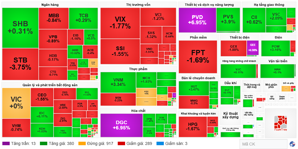Nhìn vào bản đồ thị trường, dễ thấy có sự chênh lệch giữa số lượng mã tăng và giảm. Cụ thể, có đến 393 mã tăng giá, bao gồm 13 mã tăng trần, áp đảo so với 292 mã giảm giá, trong đó chỉ 3 mã giảm sàn. Tuy nhiên, VN-Index kết phiên dưới tham chiếu, nguyên nhân đến từ diễn biến kém khả quan của nhiều cổ phiếu vốn hóa lớn.