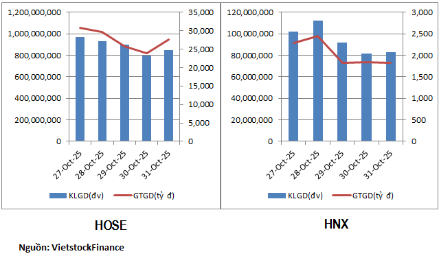 Thanh khoản ở hai sàn ghi nhận mức giảm từ 25 - 35%. Trong đó, khối lượng giao dịch ở HOSE mất mốc 1 tỷ đơn vị/phiên khi chịu mức giảm 26%. Giá trị giao dịch bình quân giảm gần 27% còn hơn 27.5 ngàn tỷ đồng/phiên.