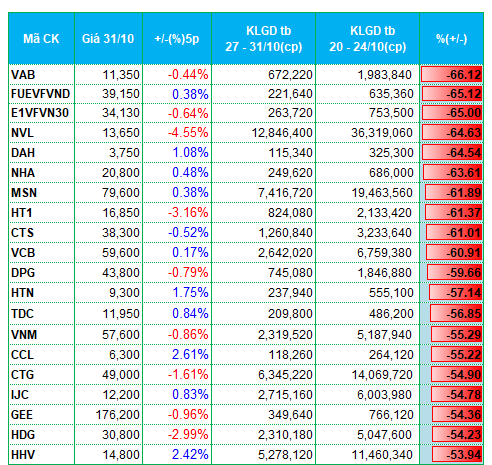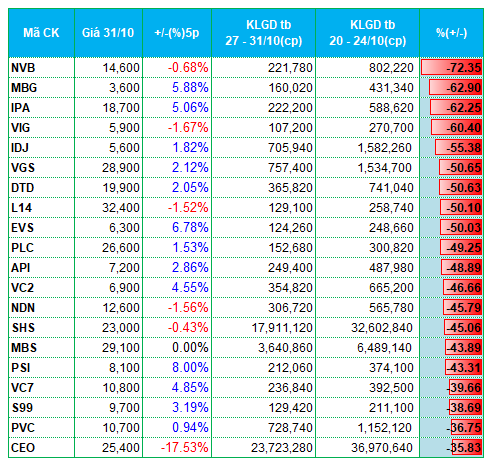 Nhiều đại diện của nhóm chứng khoán góp mặt trong top giảm mạnh thanh khoản. CTS, VIG, EVS, SHS, MBS, PSI giảm khối lượng giao dịch từ 40 - 60% so với tuần trước.