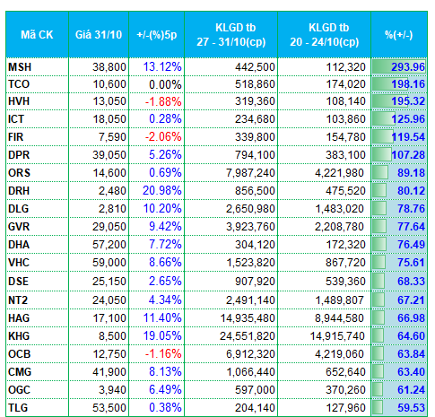 * Danh sách các mã tăng, giảm thanh khoản nhiều nhất xét đến khối lượng giao dịch bình quân trên 100,000 đơn vị/phiên.