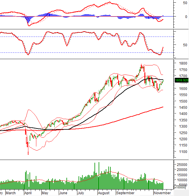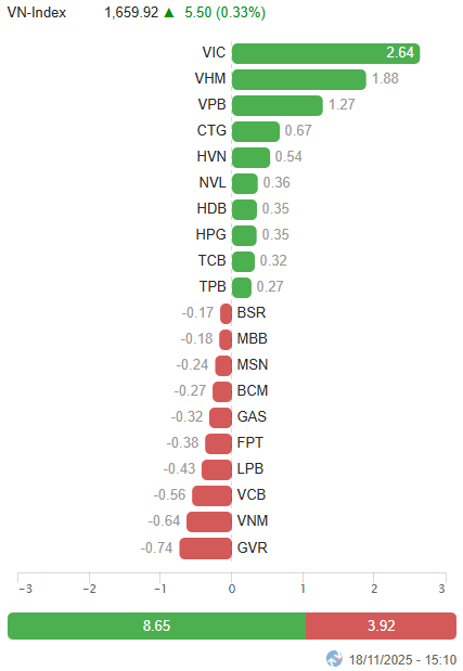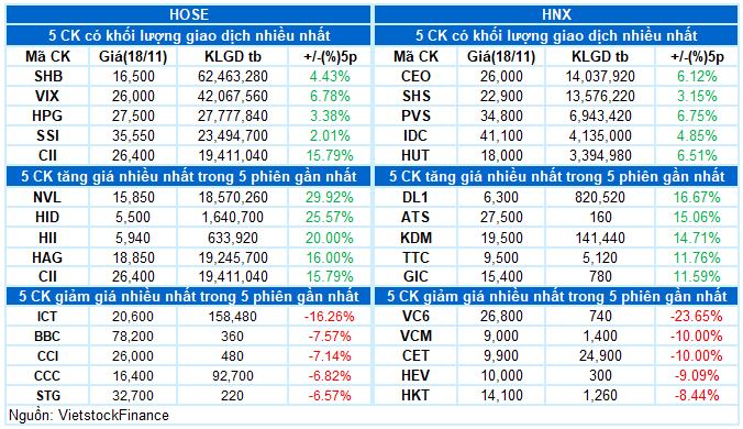 - Thị trường trở lại trạng thái phân hóa trong phiên giao dịch 18/11. VN-Index chủ yếu giằng co trong biên độ hẹp suốt phiên sáng với bức tranh xanh đỏ đan xen, thanh khoản cũng không có nhiều thay đổi so với phiên trước. Áp lực bán dần gia tăng trong đầu phiên chiều khiến VN-Index có thời điểm lùi về dưới 1,650 điểm, tuy nhiên lực cầu cũng nhanh chóng xuất hiện trở lại để kéo chỉ số về trạng thái cân bằng. Độ rộng cải thiện đáng kể trong cuối phiên, lực kéo trụ lớn giúp VN-Index đóng cửa với mức tăng 5.5 điểm, đạt 1,659.92 điểm.