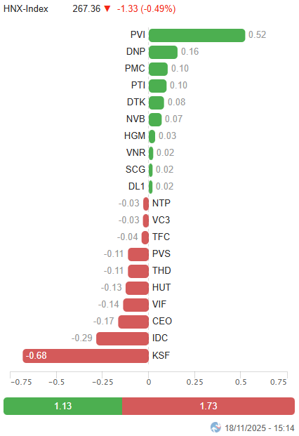 - Các chỉ số chính biến động trái chiều trong phiên giao dịch ngày 18/11. VN-Index tiếp tục tăng 0.33%, lên mức 1,659.92 điểm; trong khi HNX-Index giảm 0.49%, xuống còn 267.36 điểm.