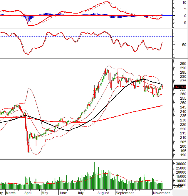 VN-Index tăng điểm phiên thứ 3 liên tiếp và chuẩn bị test lại đường SMA 50 ngày. Các chỉ báo Stochastic Oscillator và MACD tiếp tục hướng lên sau khi cho tín hiệu mua. Nếu trạng thái này được giữ vững trong những phiên tới thì triển vọng lạc quan trong ngắn hạn vẫn được duy trì.