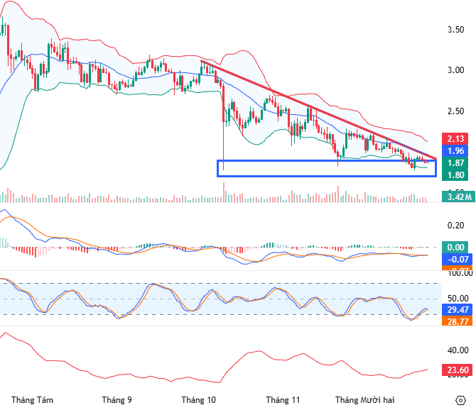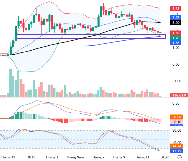 Ở khung đồ thị ngày, giá của XRP đang kiểm tra lại đáy cũ tháng 10/2025 (tương đương vùng 1.7-1.9 USD) và tiếp tục nằm dưới đường Middle của Bollinger Bands.