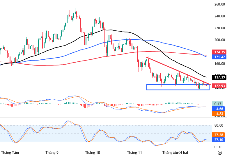Hiện tại, giá đồng tiền này đang kiểm tra cạnh dưới (tương đương vùng 115-125 USD) của mẫu hình Descending Triangle trong bối cảnh chỉ báo MACD đang tăng và tiến về gần mức 0 sau khi cho tín hiệu mua. Nếu các tín hiệu kỹ thuật tiếp tục cải thiện và giá của SOL vẫn được hỗ trợ tốt ở vùng giá hiện tại thì nhịp hồi phục kỹ thuật ngắn hạn có thể sớm xuất hiện trở lại.