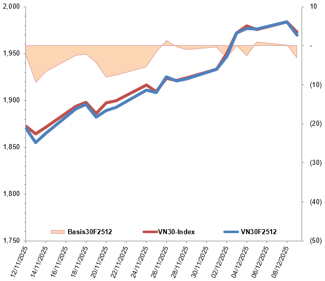 Trong phiên giao dịch ngày 09/12/2025, VN30F2512 mở cửa nhanh chóng chịu sức ép mạnh từ phe Short, khiến hợp đồng lao dốc trong suốt buổi sáng. Bước sang phiên chiều, tuy bên mua đã nỗ lực giúp hợp đồng này dần hồi phục về sát mốc tham chiếu nhưng áp lực bán vẫn có phần lấn lướt hơn khiến F2512 đảo chiều giảm nhẹ và đóng cửa tại mức 1,970 điểm.