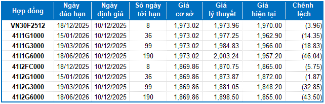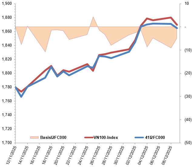 Ngoài ra, các hợp đồng tương lai VN100 đồng loạt giảm điểm trong phiên giao dịch ngày 09/12/2025. Cụ thể, 41I2FC000 (I2FC000) giảm 0.71%, còn 1,865 điểm; 41I2G1000 (I2G1000) giảm 0.1%, còn 1,872 điểm; hợp đồng 41I2G3000 (I2G3000) giảm 1.07%, còn 1,848.2 điểm; hợp đồng 41I2G6000 (I2G6000) giảm 0.43%, còn 1,855 điểm. Chỉ số cơ sở VN100-Index kết phiên ở mức 1,869.86 điểm.