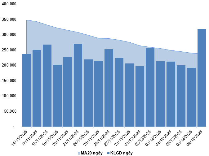 Trong phiên giao dịch ngày 09/12/2025, VN30-Index giảm điểm cùng với khối lượng giao dịch có sự gia tăng cho thấy tâm lý không mấy lạc quan của nhà đầu tư.