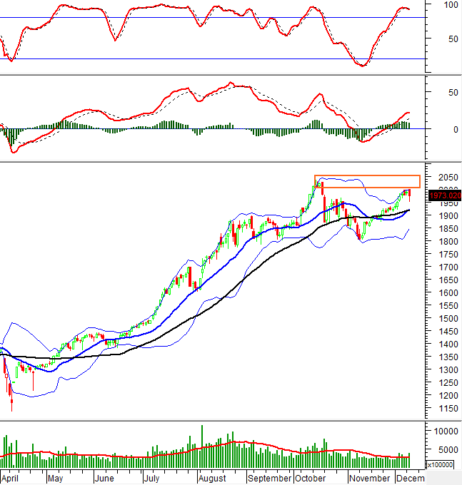 Hiện tại, chỉ báo Stochastic Oscillator tiếp tục giảm sau khi cho tín hiệu bán trong vùng quá mua (Overbought). Nếu chỉ báo tiếp tục suy yếu và rơi khỏi vùng này trong các phiên tới thì rủi ro điều chỉnh ngắn hạn sẽ tăng cao.