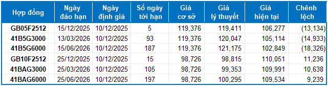 Dựa trên phương pháp định giá hợp lý với thời điểm khởi đầu ngày 10/12/2025, khung giá hợp lý của các hợp đồng tương lai đang được giao dịch trên thị trường được thể hiện như sau: