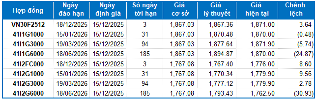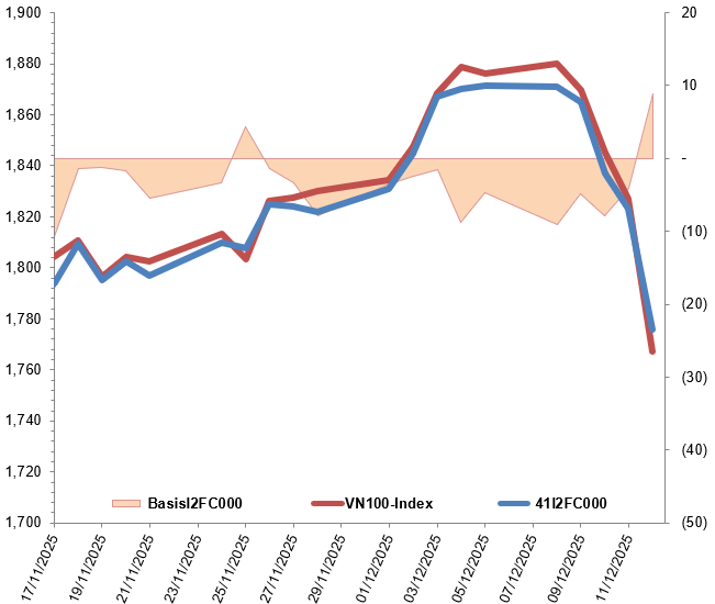 Ngoài ra, các hợp đồng tương lai VN100 đồng loạt giảm điểm trong phiên giao dịch ngày 12/12/2025. Cụ thể, 41I2FC000 (I2FC000) giảm 2.83%, còn 1,776 điểm; 41I2G1000 (I2G1000) giảm 1.77%, còn 1,779.9 điểm; hợp đồng 41I2G3000 (I2G3000) giảm 2.5%, còn 1,779.9 điểm; hợp đồng 41I2G6000 (I2G6000) giảm 2.26%, còn 1,762.5 điểm. Chỉ số cơ sở VN100-Index kết phiên ở mức 1,767.08 điểm.