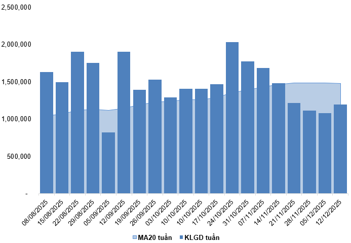 Khối lượng và giá trị giao dịch của thị trường phái sinh lần lượt giảm 7.42% và 9.13% so với phiên ngày 11/12/2025. Tính chung cả tuần, khối lượng và giá trị giao dịch tuần lần lượt tăng 32.66% và 32.17% so với tuần trước.