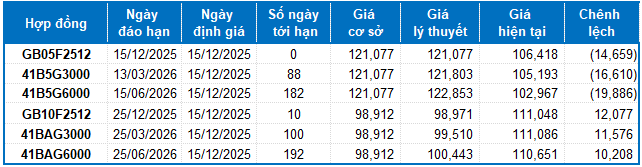 Dựa trên phương pháp định giá hợp lý với thời điểm khởi đầu ngày 15/12/2025, khung giá hợp lý của các hợp đồng tương lai đang được giao dịch trên thị trường được thể hiện như sau: