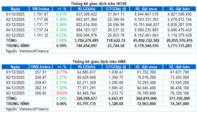 Giao dịch: Các chỉ số chính tăng giảm trái chiều trong phiên giao dịch ngày 05/12. VN-Index tăng 0.23%, lên mức 1,741.32 điểm, trong khi HNX-Index giảm 0.63%, xuống còn 260.65 điểm. Xét cho cả tuần, VN-Index có thêm tổng cộng 50.33 điểm tăng (+2.98%), còn HNX-Index tăng nhẹ 0.74 điểm (+0.28%).